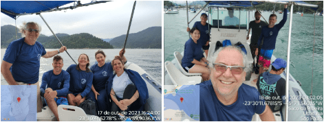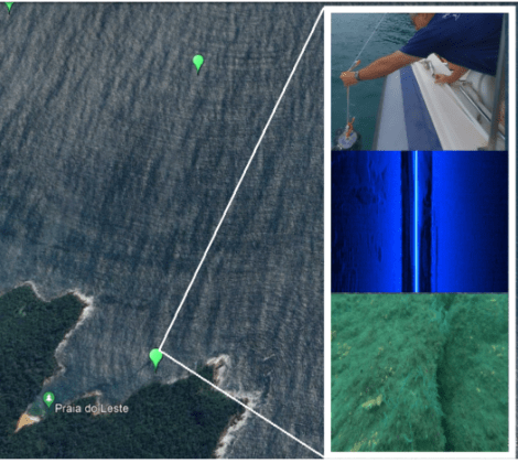 Por fim, o monitoramento ambiental realizado na campanha de mar também ocorre por meio de inspeção visual que tem como objetivo localizar objetos (petrechos de pesca, objetos plásticos e outros materiais) no costão rochoso e na linha d’água (Casarini et al., 2015, Costa et al, 2015, Ierodiaconou et al., 2018, Burguera et al., 2020). Para realizar a inspeção visual, é utilizado uma câmera profissional que consta com lente objetiva de longo alcance para realizar a inspeção visual da superfície do mar e fotografar o costão rochoso no entorno da área de estudo. Quando necessário são realizados mergulhos e desembarque pontuais para verificação, identificação e remoção.