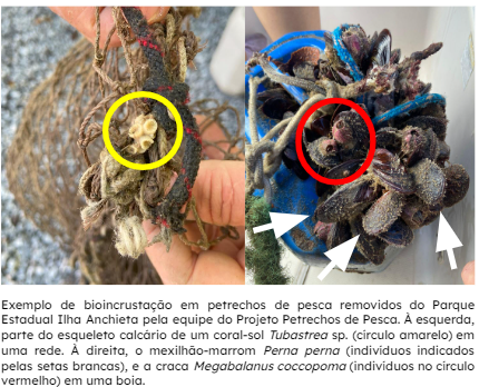 As fotos abaixo mostram uma rede e uma boia, ambas encontradas no PEIA, e associadas a três espécies de organismos incrustantes: o coral-sol do gênero Tubastrea (esquerda), o mexilhão-marrom Perna perna (direita) e a craca Megabalanus coccopoma (direita). Todos esses organismos são invasores, ou não nativos do Brasil. Isso significa que eles competem com a fauna local por espaço e alimento, muitas vezes prejudicando nossas espécies nativas. Em específico, o coral-sol é um organismo que altera profundamente a comunidade de fundo, diminuindo a cobertura de espécies endêmicas de coral. O fato do coral-sol ter sido encontrado associado a uma rede de pesca é um achado bem preocupante, porque mostra a rapidez com que essa espécie é capaz de crescer em um substrato de origem humana.