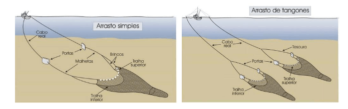 Já a pesca de arrasto é uma técnica ativa, ou seja, a embarcação precisa se movimentar e puxar a rede para que os peixes sejam apanhados. Para a realização dessa modalidade de pesca, são utilizadas redes em formato cônico. Isso faz com que os recursos-alvo fiquem aprisionados no interior da rede. A pesca de arrasto pode ser praticada por embarcações de diferentes tamanho, sendo que podem ser utilizadas uma (arrasto simples) ou duas redes (arrasto duplo). No arrasto simples é utilizado um elemento diferencial, as portas, que servem para deixar as redes abertas. Já no arrasto duplo, as embarcações são equipadas com um dispositivo chamado tangone, de cada lado, que funciona como uma espécie de braço mecânico que irá tracionar as redes de cada lado. A pesca de arrasto duplo é comumente utilizada na pesca de camarão rosa e camarão-de-sete-barbas.
