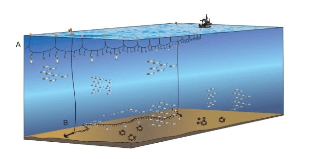 Figura 7- Operação de pesca com espinhel de superfície (A) e espinhel de fundo (B) (Adaptado de Montealegre-Quijano et al., 2011).
